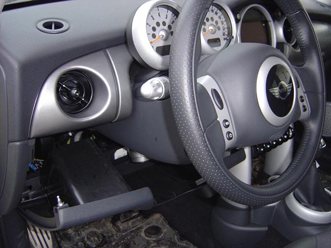 Fotos de abajo muestran ejemplos del aspecto de nuestros sistemas de seguridad de coche cerradura REDEZ y Garra de León en la instalación en automóviles de Mini.